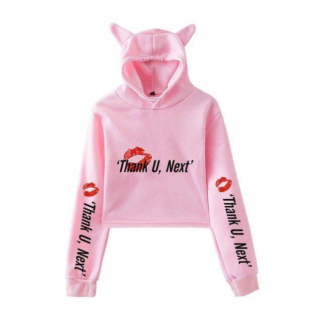 Soft pink hoodie with cat ears and "Thank U, Next" text, Ariana Grande-inspired merchandise.